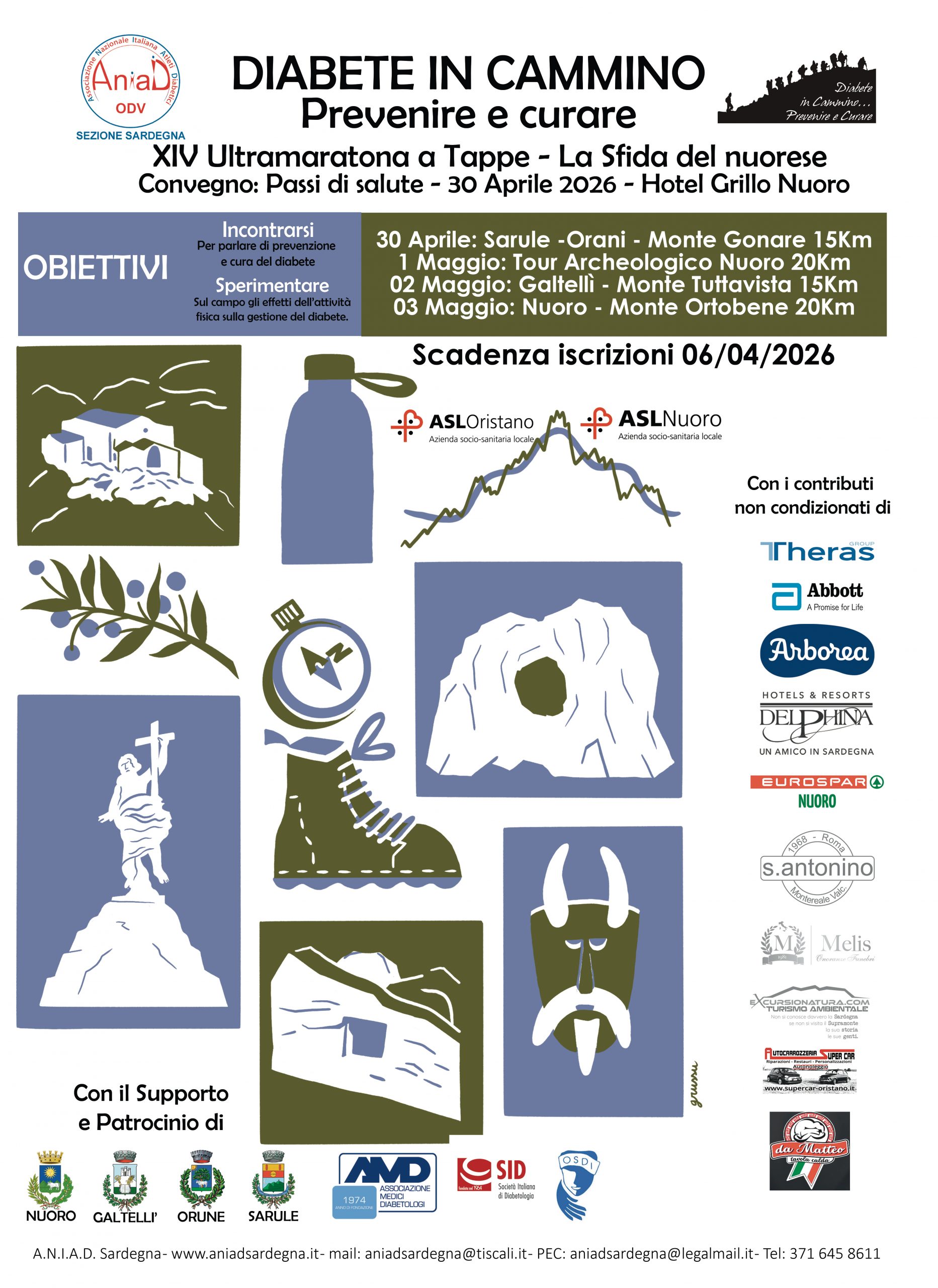 Nel 2025 sessanta chilometri. Saranno ottanta chilometri quest’anno. Non più il Nord della Sardegna, ma il Nuorese, ma sempre in cammino per curare “all’aria aperta” il diabete di tipo 1 e sensibilizzare le comunità locali sui corretti stili di vita per prevenire il diabete di tipo 2. Dal 30 aprile al 3 maggio 2026 ritorna l’appuntamento annuale con l’Ultramaratona a tappe della sezione sarda dell’Associazione Nazionale Italiana Atleti Diabetici con la collaborazione della Asl 5 di Oristano e della Asl 3 di Nuoro. Il tema rimane lo stesso. Tema, che è, anche, un messaggio e un obiettivo: “Diabete in cammino: prevenire e curare”. La bandiera della prevenzione di Aniad Sardegna questa volta sventolerà nel cuore del Nuorese e, in particolare fra Nuoro, Orani, Sarule e Galtellì.