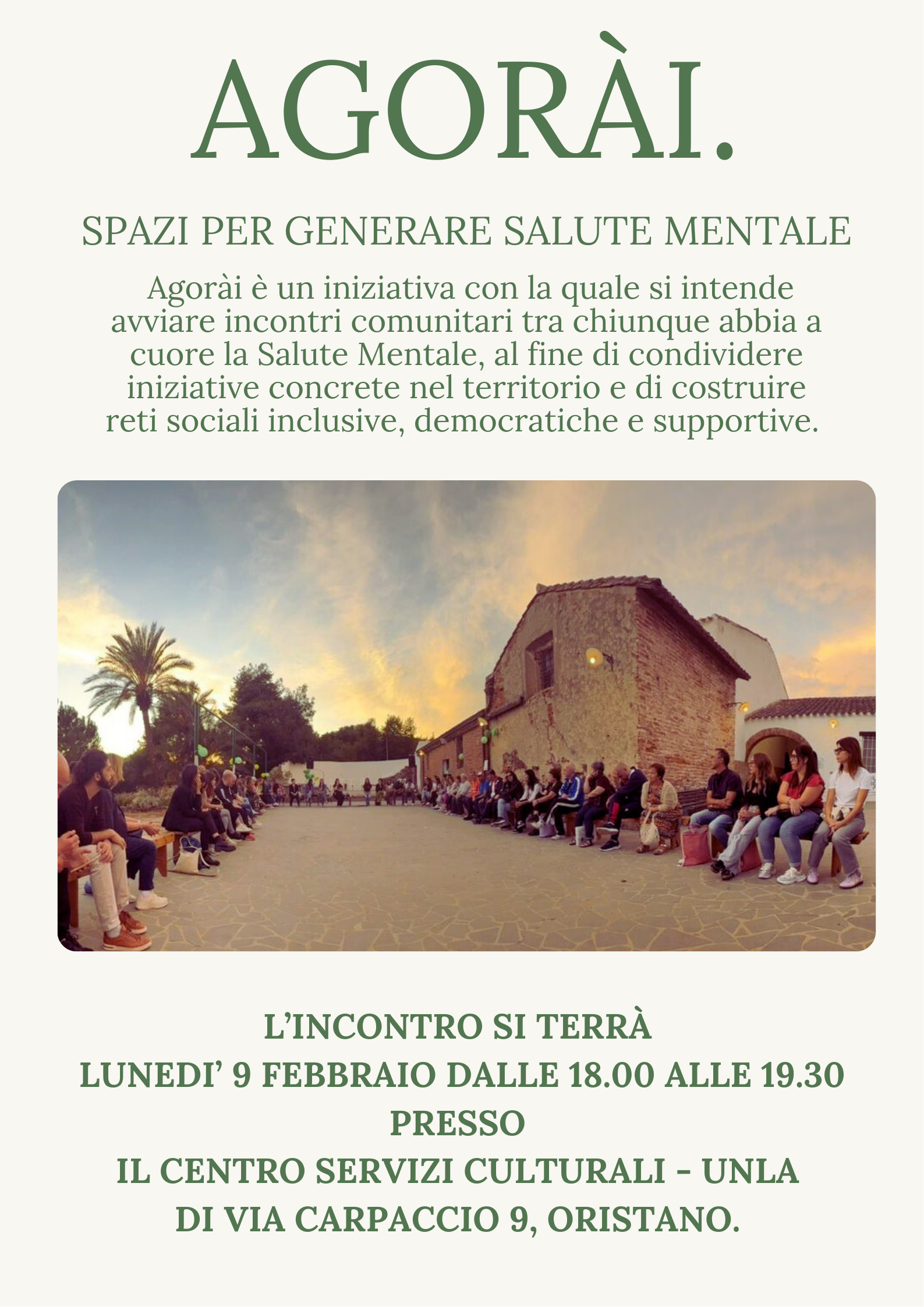 Lunedì 9 febbraio, alle ore 18.00, nella sala del Centro Servizi Culturali Unla (via Carpaccio 9) di Oristano, “Agorài”, il nuovo incontro promosso dal Centro di Salute Mentale (Csm) di Oristano ed aperto a tutta la popolazione, in particolare alle associazioni e agli enti del terzo settore impegnati in questo campo.