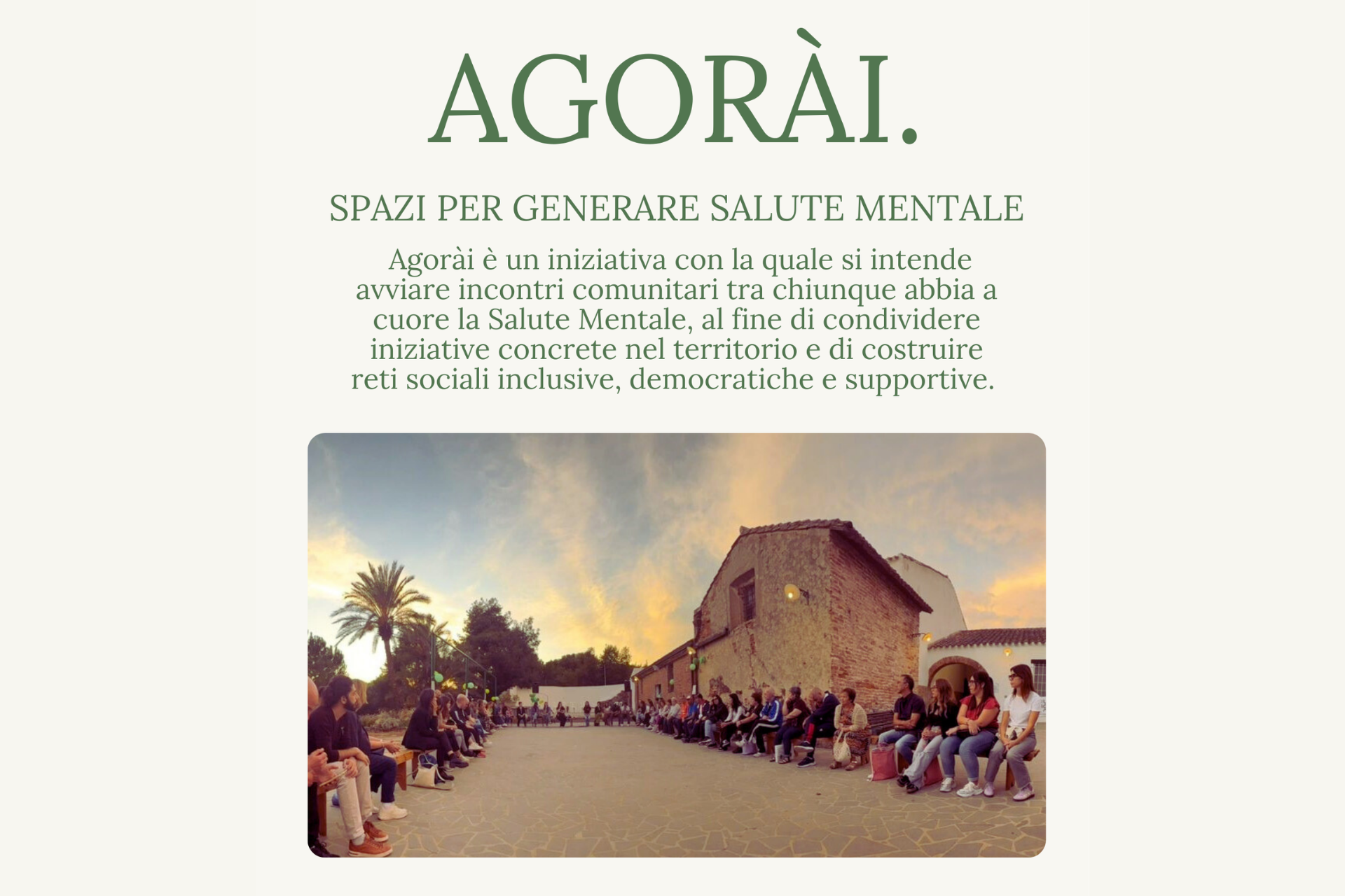 “Agorài – spiegano gli organizzatori – è un progetto che nasce dal desiderio di far incontrare persone, associazioni ed enti del territorio che si occupano di salute mentale, per conoscersi, ascoltarsi e progettare insieme. Attraverso un ciclo di incontri comunitari, “Agorài” vuole diventare uno spazio fisico e relazionale, aperto e accogliente, dove ciascuno possa sentirsi parte attiva, su un piano di pari dignità. Un luogo in cui condividere esperienze, bisogni, idee e buone pratiche, e da cui far nascere dialogo, collaborazione e nuove iniziative. Agorài è uno spazio da abitare insieme, per trasformare l’incontro in relazione e la relazione in cura. Invitiamo caldamente le associazioni, gli enti del terzo settore e tutti i soggetti interessati a partecipare, a presentarsi alla comunità e a contribuire alla costruzione di reti sociali naturali di cura, capaci di sostenere le persone e rafforzare il tessuto umano del territorio” è l’appello degli operatori del Csm.