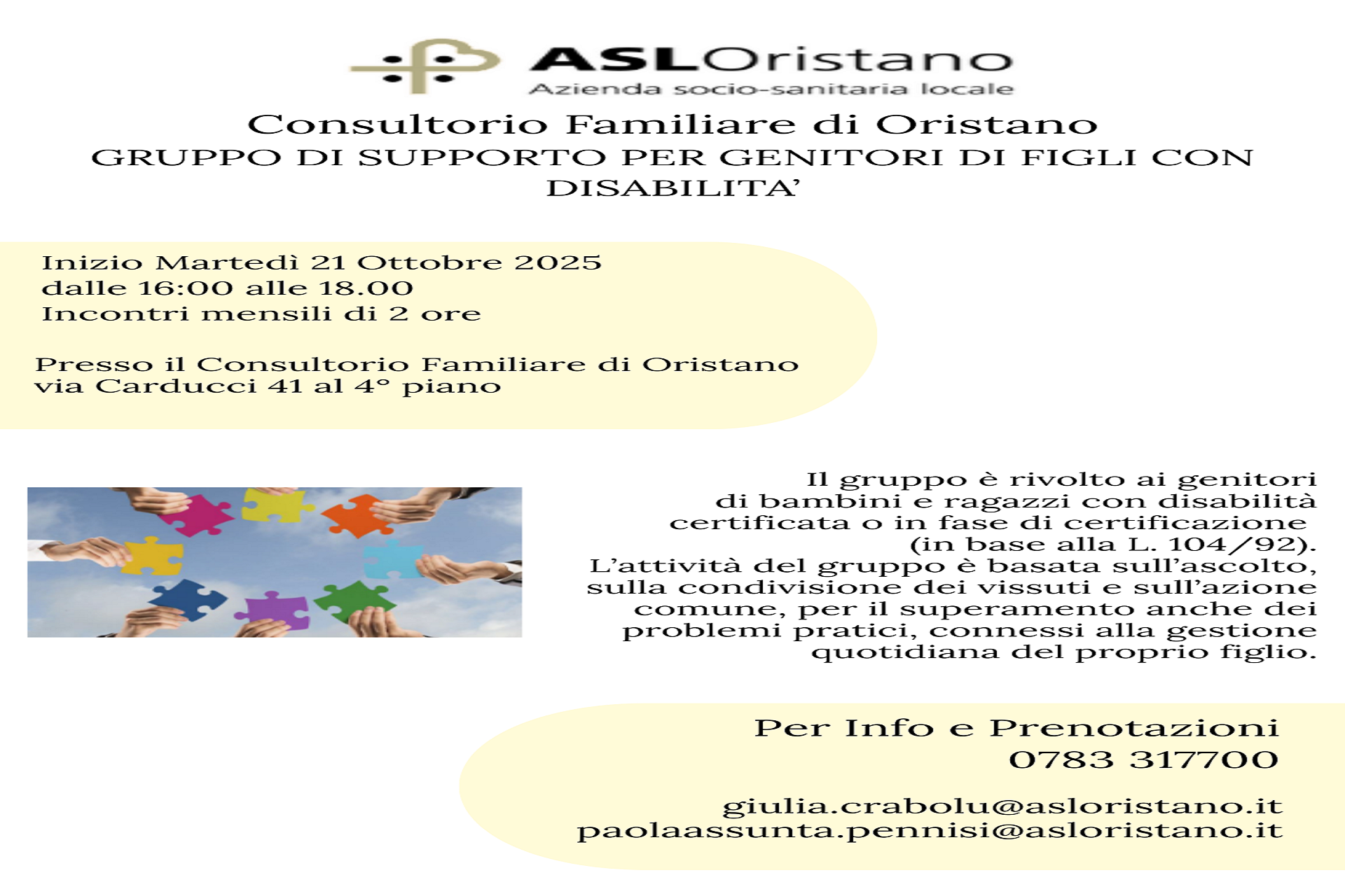 Il Consultorio familiare di Oristano ha attivato un gruppo di sostegno per i genitori con figli, bambini e ragazzi, con disabilità certificata o in fase di certificazione. All’interno tutti i dettagli sul funzionamento del gruppo e le modalità di iscrizione
