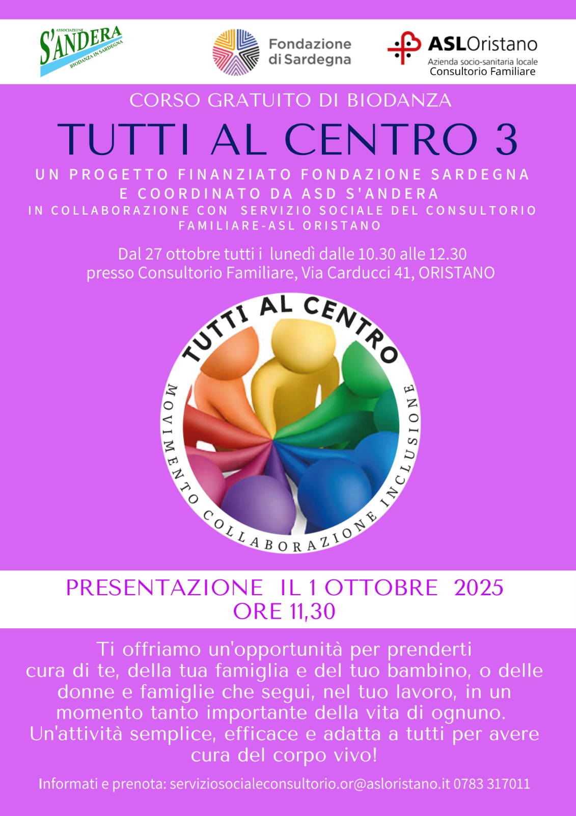 Domani, mercoledì 1 ottobre, alle ore 11.30, al Consultorio familiare di Oristano (via Carducci, 41) presentazione del progetto “Tutti al Centro 3”, coordinato dall’associazione S’Andera Biodanza in Sardegna in collaborazione con il Servizio Sociale dello stesso Consultorio e dedicato ai neogenitori e alle famiglie in dolce attesa.
